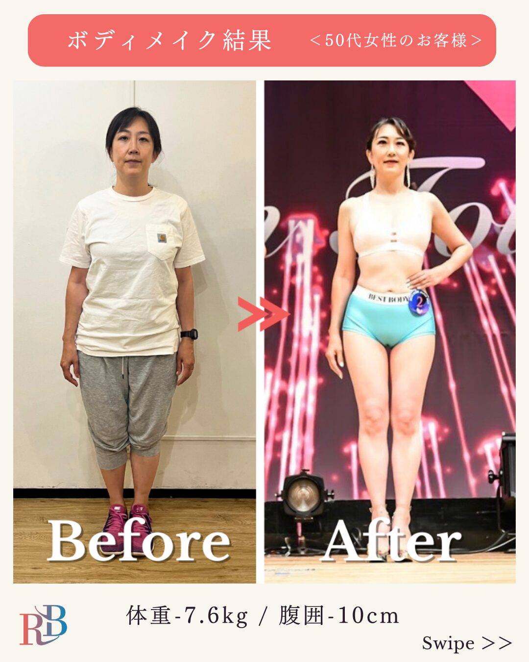 食事やエステだけではこんなに短期間で綺麗には痩せられなかったと思うので、筋トレ中心のダイエットを選んで正解でした。世の中色々なダイエット方法がありますが、健康のためにも美容のためにも、RB-Fitnessさんに出会えて本当によかったと思っています。