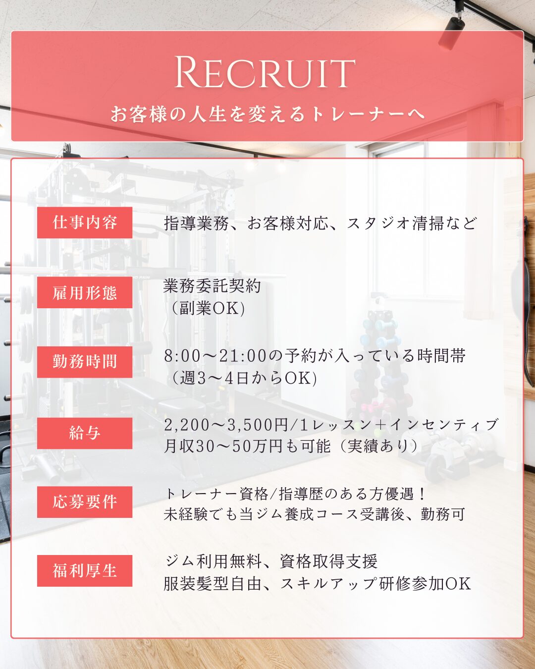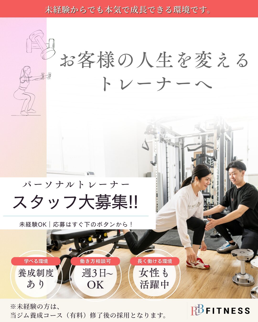 ただし、未経験の方は当ジムの養成講座(有料)を受講・修了後、現場デビューとなります。